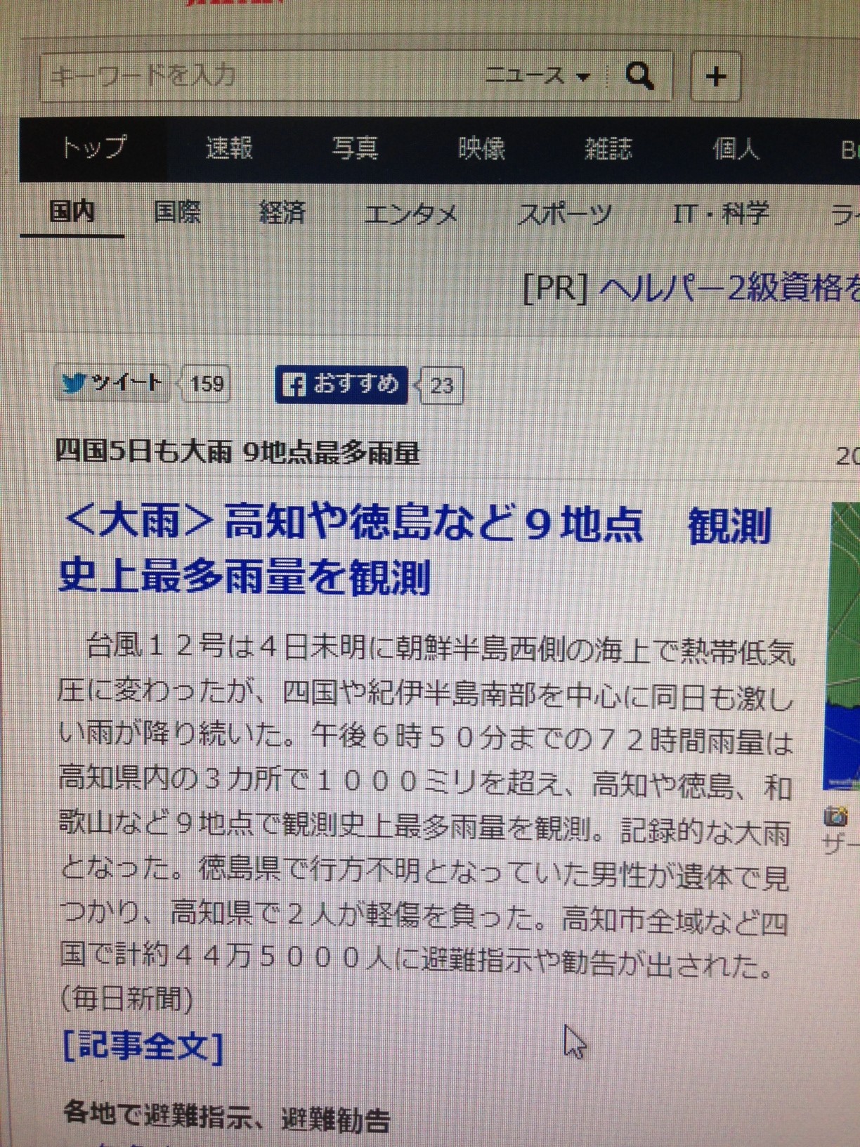 台風12号に続き、11号。これが観測史上最多雨量で土砂崩れも引き起こし、避難勧告も出る事態に。